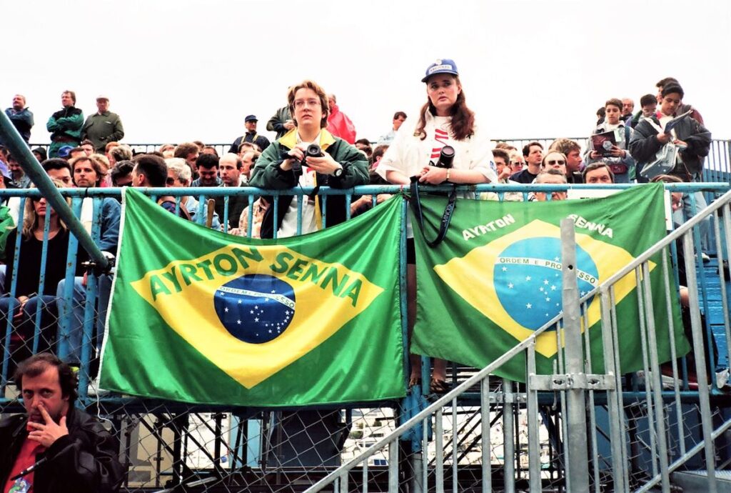 Three years ago, I published my account of the 1994 Monaco Grand Prix, the first race after Ayrton Senna’s death. I was an accredited journalist at the race and took many photos. One of them featured two women in the grandstand with a Brazilian flag (see main image above). Linda Danton-Vizor was one of those women and reached out after reading the article.