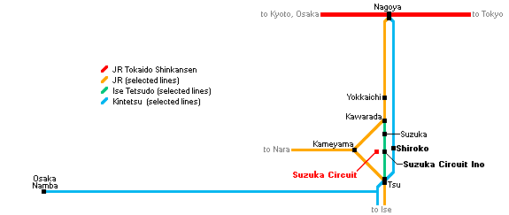 Please note that the Access page on the Suzuka Circuit website has a large amount of useful information to help you get to the circuit, including train, bus and taxi services from Nagoya, Osaka, Kyoto, Shirako, Tsu and Kameyama.