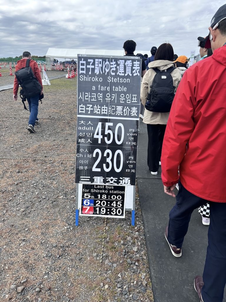 Also, the connecting bus service I was referring to is from Shiroko to the circuit. If you are staying in Shiroko you still need to pay for this (In 2018 it was 400 yen each way and the same rule applies, buy a return ticket so as to miss the queue at the end of the day. Return = 800 yen).