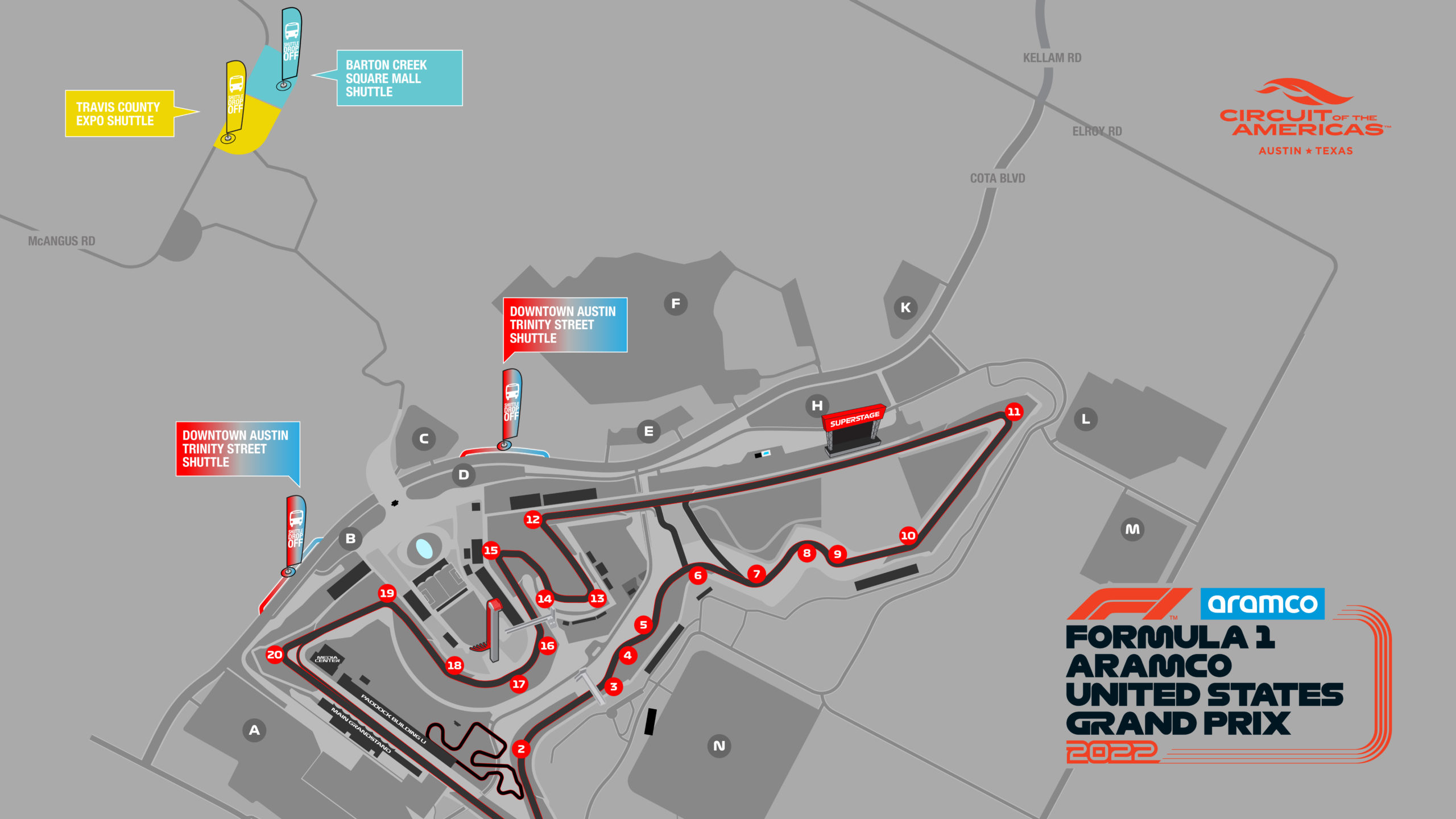 Front Gate Shuttle ($40 return per day): Ride in a climate-controlled motorcoach direct to the Grand Plaza entrance at COTA. Two pick up locations are available: Downtown (San Jacinto Blvd / East 14th St.) & Barton Creek Mall