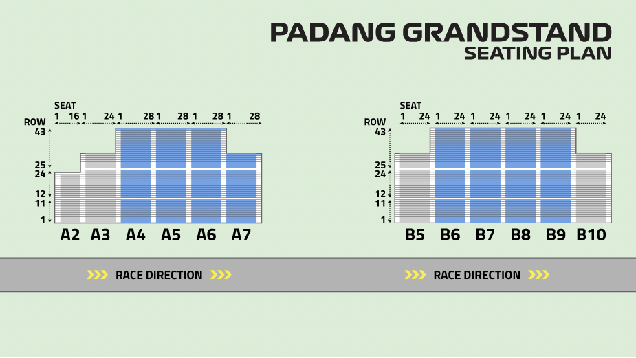 Please note that the current organization of the Padang A/B grandstands is slightly different to the above seating plan. An additional low section (A1) has been added to the end of Padang A closest to Turn 9 (Padang). The numbering system has also been changed for Padang B, which is organized into sections B1-B6 (instead of B6-B10). We will update this seating plan as soon as the 2026 version is available.