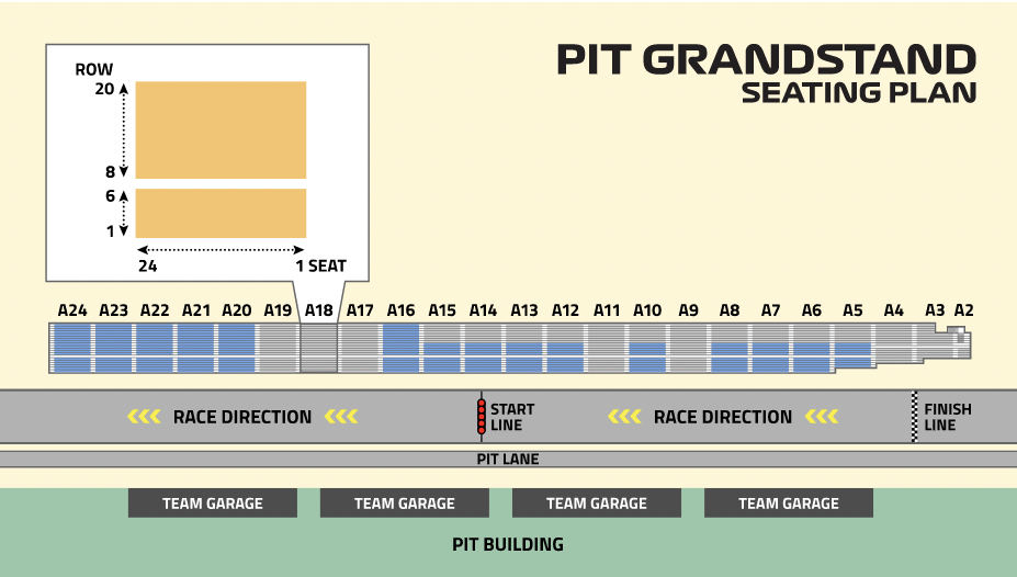 This large grandstand is separated into twenty-two sections, from A3 to A24. The section numbers follow the direction of the track, with low numbered sections closer to the final corner, pit entry and podium (as well as the pit boxes for the fastest teams) and higher section numbers closer to the pit exit and first turn. Each section has twenty-four seats and twenty rows. Row numbers start from one closest to the track and catch fencing, and twenty highest and furthest back. In most cases, the best seats are highest in the grandstand. These offer better panoramic views with less interference from the catch fencing, though it still hinders the view of the cars even from the top rows. (Please note that section A2 is no longer offered and has been replaced by the Twenty3 hospitality suite.)