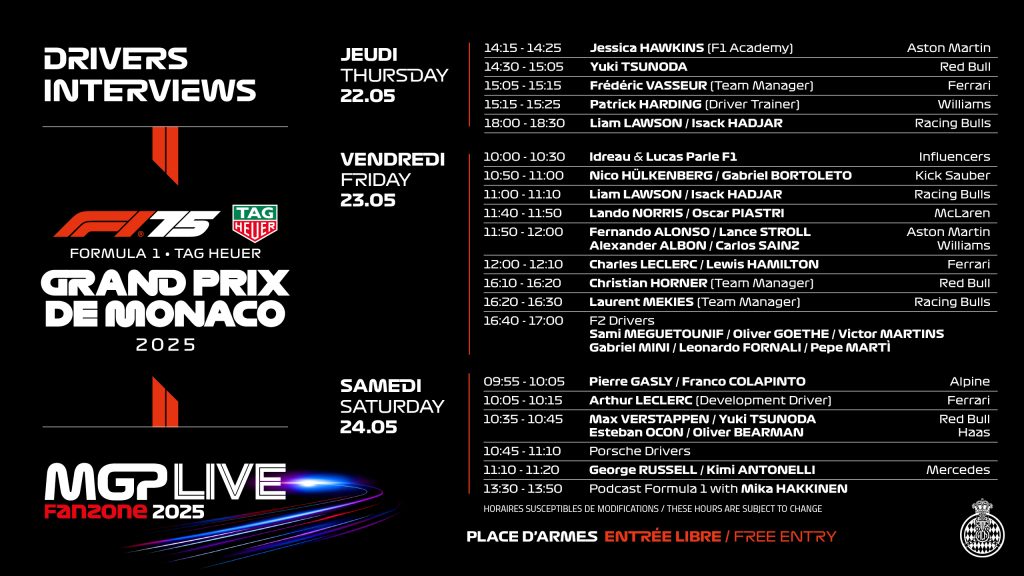 All twenty F1 drivers normally appear on stage once over the race weekend, along with other famous such as team principals and retired F1 legends. Most F1 driver interviews take place on Friday or Saturday. The appearance schedule for the 2025 Monaco Grand Prix can be found in the image below. The appearance schedule for the 2026 Monaco Grand Prix will not be confirmed until race week.