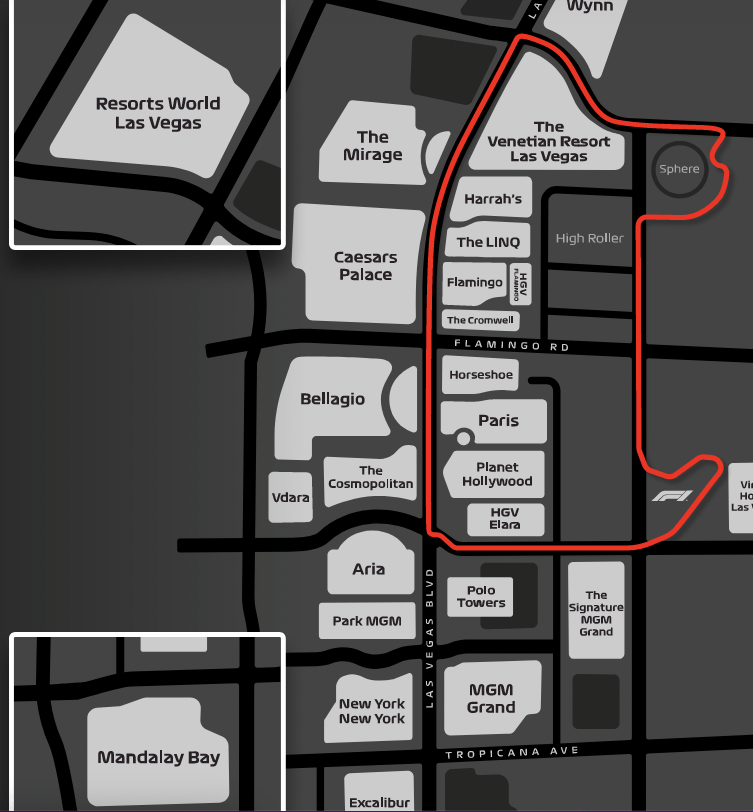 Further north is the North Koval Zone and the MSG Sphere Zone in the northeast corner of the circuit. Additional zones include the Wynn Zone in the northwest corner of the circuit, the Caesars Zone (West) and the MGM Zone (Southwest corner). Below we have detailed the closest hotels and resorts to each of the planned zones at the Las Vegas Street Circuit.